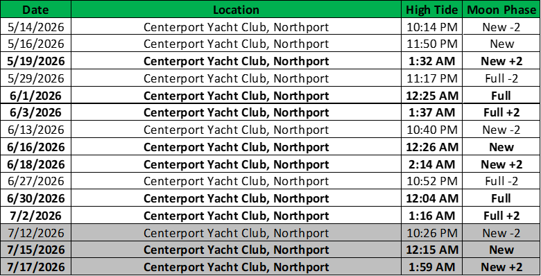 Tide Chart: *Note: Dates shaded in gray are listed as “backup” sampling nights just in case they are needed, but it is unlikely that they will be used.