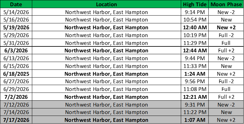 *Dates in bold font indicate that the high tide occurs after midnight on this evening, so the survey time will actually be in the early morning of the listed date.