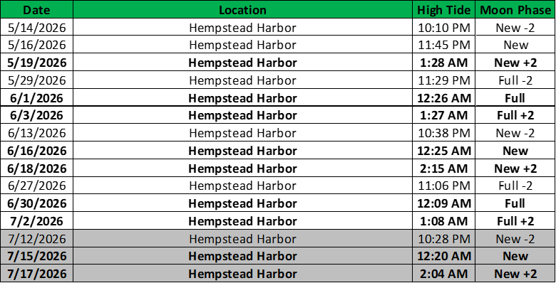 Tide Chart: *Note: Dates shaded in gray are listed as “backup” sampling nights just in case they are needed, but it is unlikely that they will be used.